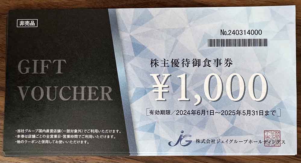 2024-06-09 【株主優待】株式会社ジェイグループホールディングス(3063) 株主優待 日本株 株式会社ジェイグループホールディングス(3063)から株主優待が届きました。 同社は名古屋に本社を置く外食チェーン運営会社です。 今回、初取得。まずはお店で使用してみたいと思います。
