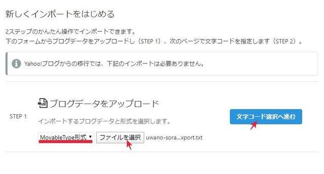 最後にメインブログに(1-6)でエクスポートしたtxtファイルをインポートします。今回ははてなブログからエクスポートしたファイルなので「MovableType形式」を選びます。