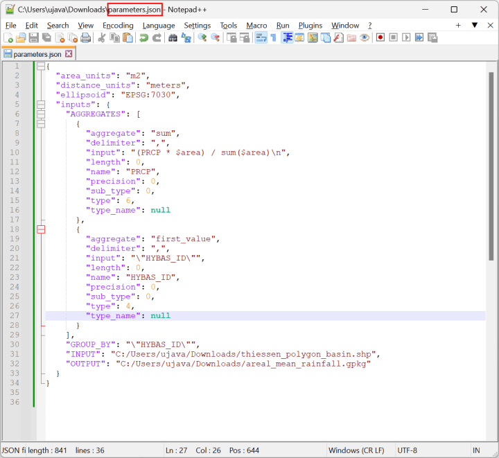 Once the configuration is copied as JSON, paste it in a text editor and save it as a file on your computer. Here we save it as a file named parameters.json (note there is no .txt at the end).