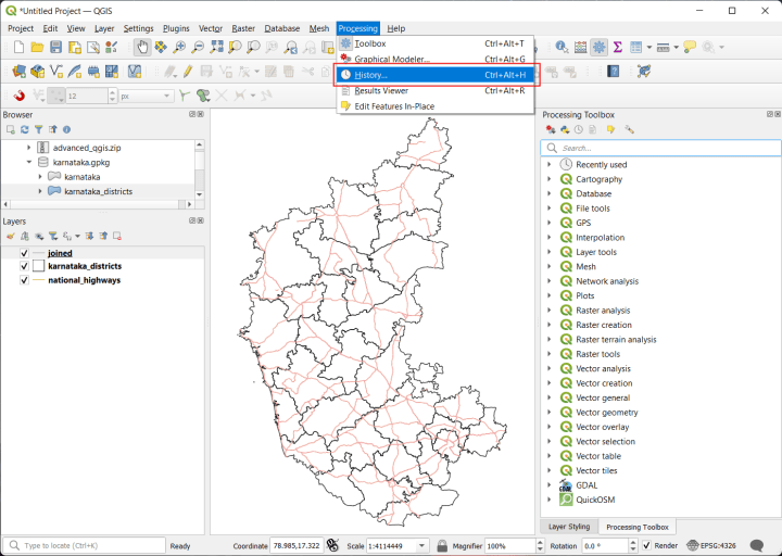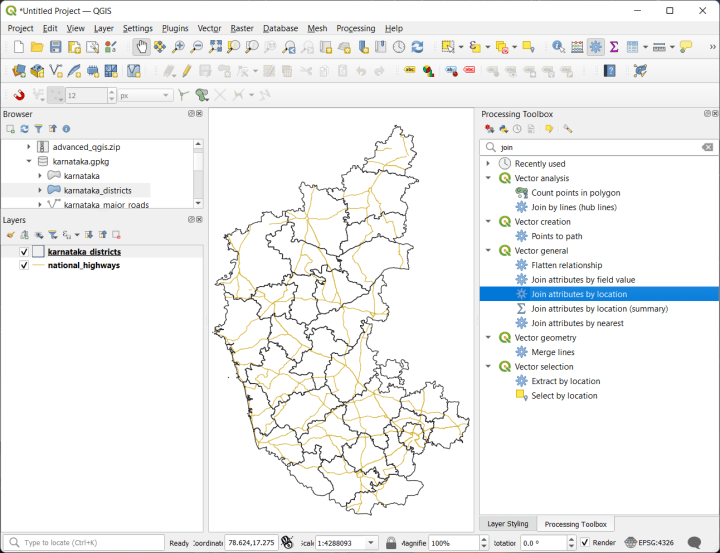 We want to join the karnataka_district polygon layer with the national_highways line layer using the Join attributes by location algorithm.