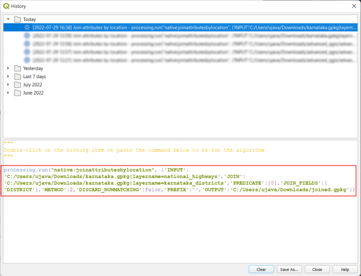 We can now build the command to run qgis_process. From the output shown in the Processing History, we can see that the id of the algorithm is native:joinattributesbylocation. For each parameter, we have the parameter name and its value. Keep the following in mind when using the values displayed in building the command