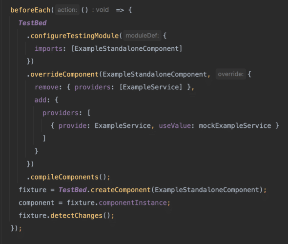 Let’s say that our standalone component depends on a service in our project, ExampleService. To mock this dependency in our test, we must use the overrideComponent method on the TestBed. This method will allow us to remove the default providers and provide our mocks. Our test setup should now look something like this: