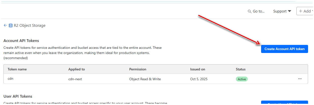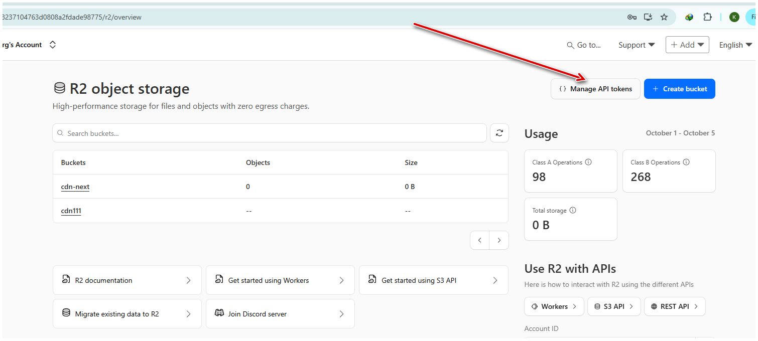 1. In R2 dashboard, click “Manage R2 API Tokens”