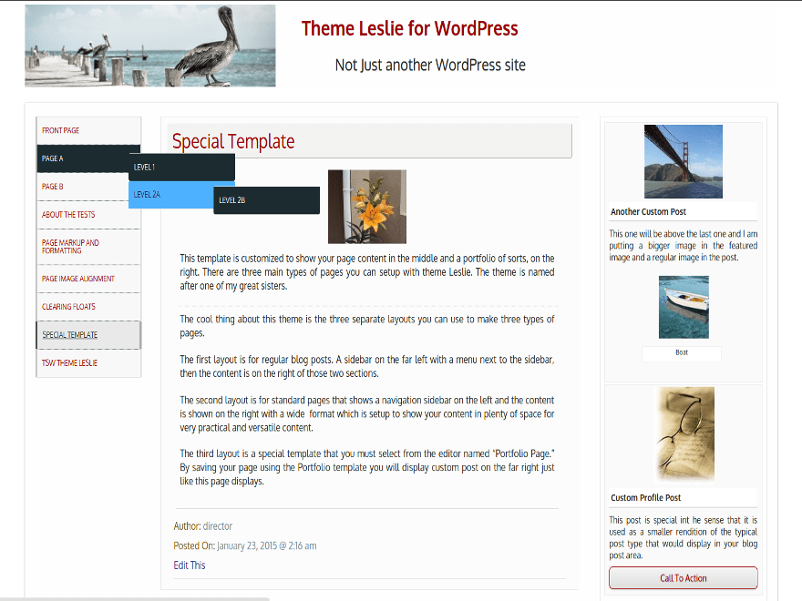 Theme has three layouts you can use to make three types of page layouts. Single posts pages and regular blog page content are displayed with content on the right and a sidebar and a navigation bar each to the left. Individual Pages that you create are displayed with content in the middle and sidebar/menu on each side of content. There is a third layout that you can have by using the template named “Portfolio Page” to show custom posts on the far right, tiled vertically kind of like a gallery. These custom posts have their own editor and the plugin for it is installable from within the theme. Options to add social media links with icons; change link colors, background and header image. Theme uses a responsive framework but is not fully optimized for all screens. As of v. 1.3 there is option to change footer text. Demo at https://leadspilot.com/leslie/
