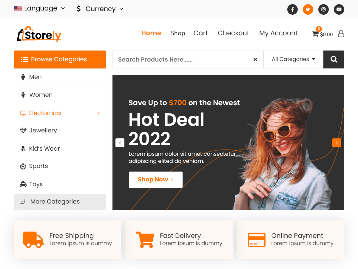 Storely is a WooCommerce multipurpose WordPress theme designed for shopping online stores. Storely is suitable for eCommerce websites such as fashion, suit, sneaker, shoes, glasses, accessories, supermarket … or anything you want. The theme is built with lots of cool features and fully eCommerce functionalities in Pro version. Visit Storely pro demo. https://preview.sellerthemes.com/pro/storely