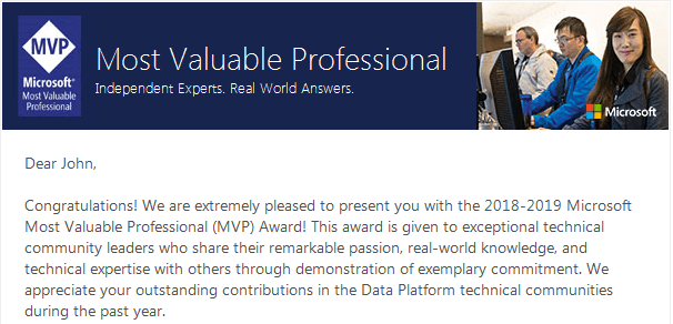 If you work in the Microsoft technology space you are probably aware of the mass of people who refresh their inboxes like a mad man on the first of the month. It used to be on the first of every quarter but that has since changed. I’ll admit that I was one of those individuals for some time. For those that might not know, I’m referring to the Microsoft MVP award program. This award program is an annual award that recognizes technology community leaders worldwide. These leaders actively share their knowledge, expertise with others in many different facets of the Microsoft technology stack. Award recipients have a deep commitment to the community and display a willingness to help others.
