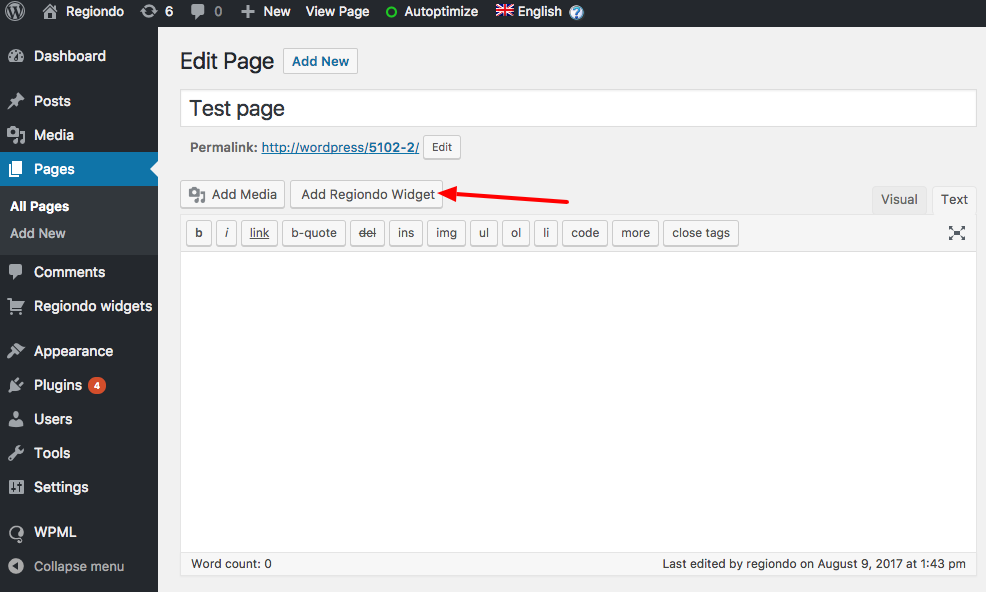 - Go to any page or post where you want to use Regiondo Widget and click “Add Regiondo Widget”. To add content to a widget, drag it to the required position in the sidebar.