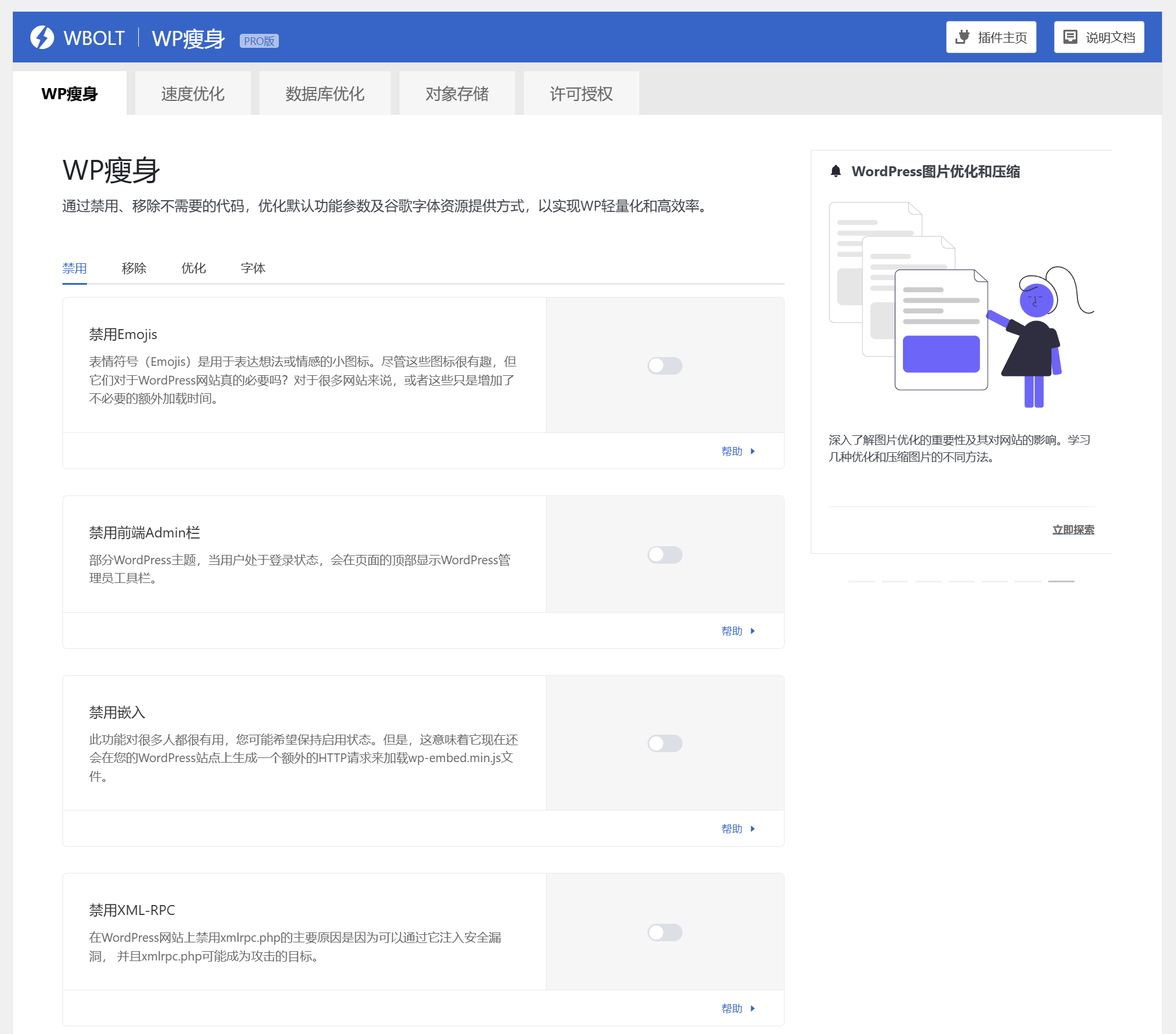 为此,我们开发了这款WordPress性能优化插件-WPTurbo。该插件的功能模块主要包括WP瘦身、速度优化、数据库优化及对象存储。
