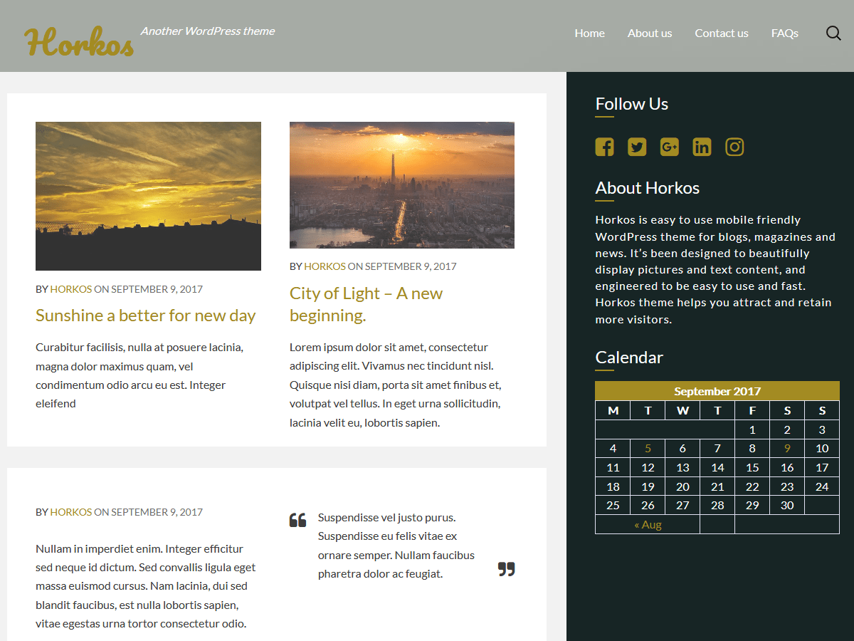 Horkos is easy to use mobile friendly WordPress theme for blogs, magazines and business websites. It’s been designed to beautifully display pictures and text content, and engineered to be easy to use and fast. The Horkos theme helps you attract and retain more visitors. Theme provides clean and minimalistic layouts that make your website look great on any kind of device.