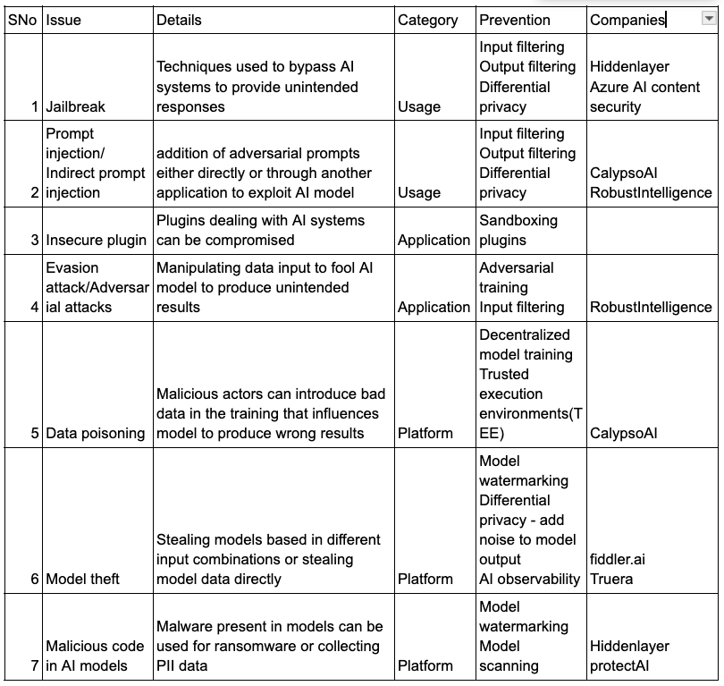 - Application Security: This layer addresses the security of AI applications, including the models themselves. Examples include indirect prompt injections or vulnerabilities in plugins that can compromise application integrity.