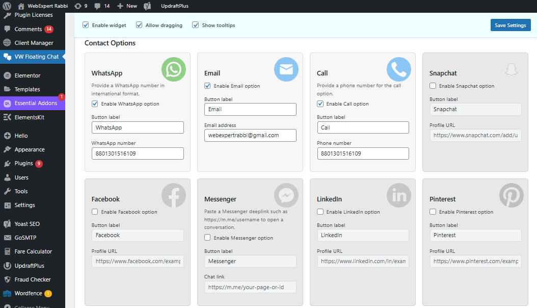- Navigate to Settings VW Floating Chat to configure channels, positions, and labels.