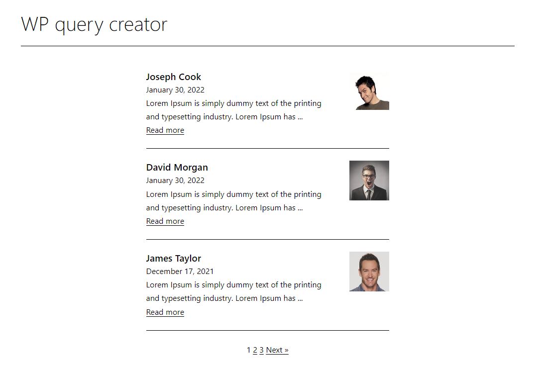 Sometimes when you want to display a post or custom post loop middle of the page, you need to create a new page template OR create a new shortcode in functions.php. In this case, WP query creator is very helpful for you, just create a new WP query through this plugin and use this sort code in your page editor.