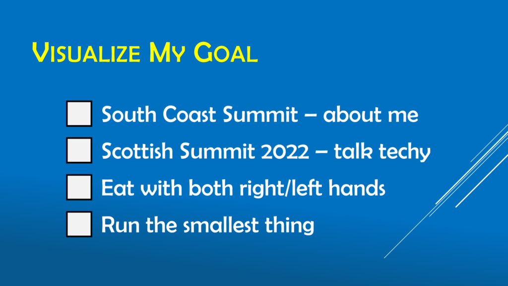 I have a visualizing My Goal. Something that’s a good tip from Paddy Byrne at Scottish Summit – only one week after my stroke, in February 2021.