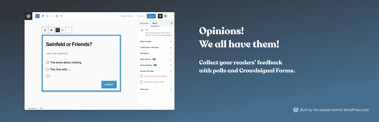 The Crowdsignal Forms plugin allows you to create and manage polls right from within the block editor.
