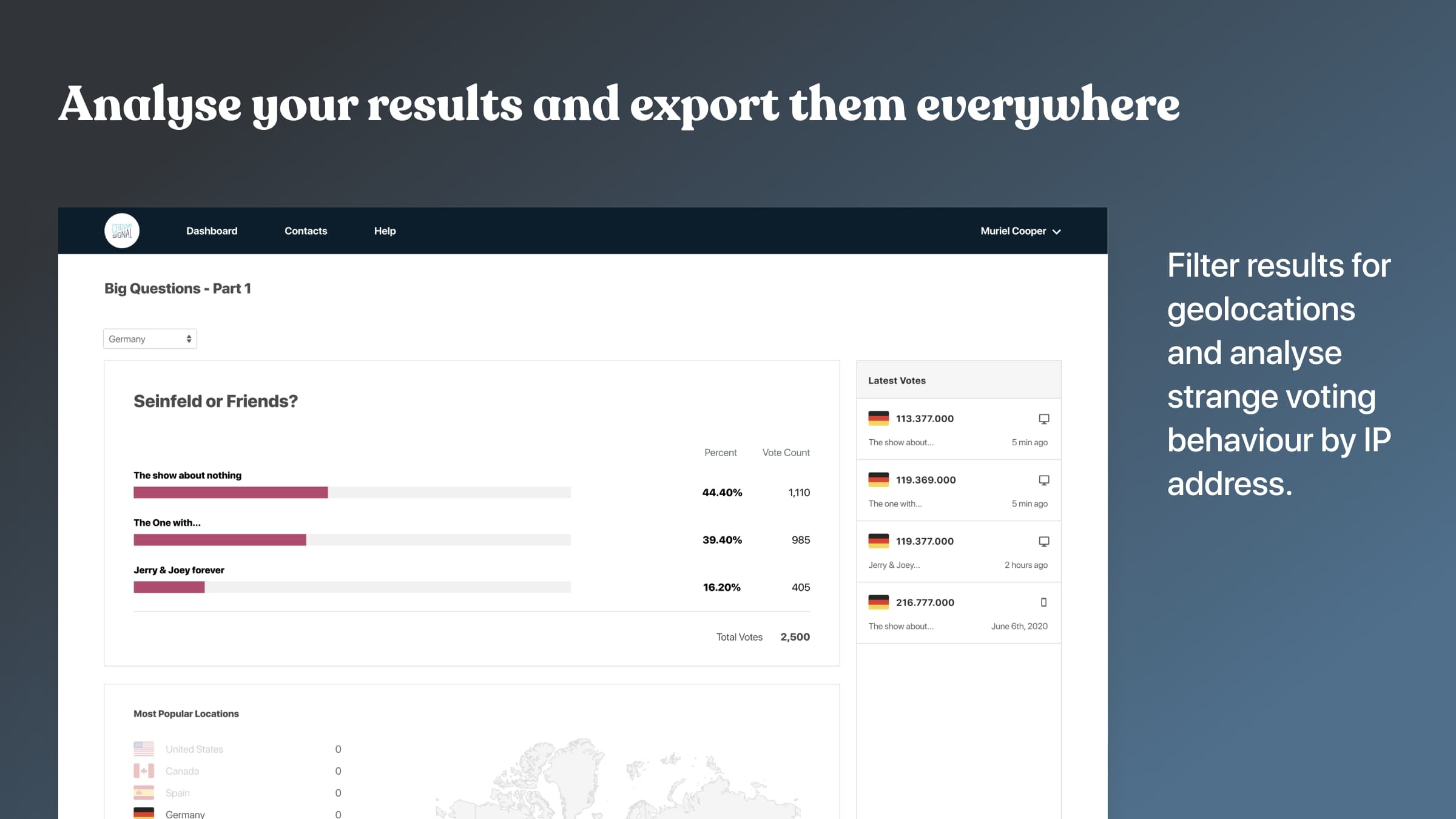 With Crowdsignal’s results page you can view all responses as they come in. See the geo-locations of your voters and analyze IP addresses for any suspicious voting behavior. See advanced stats and analytics for understanding your audience.