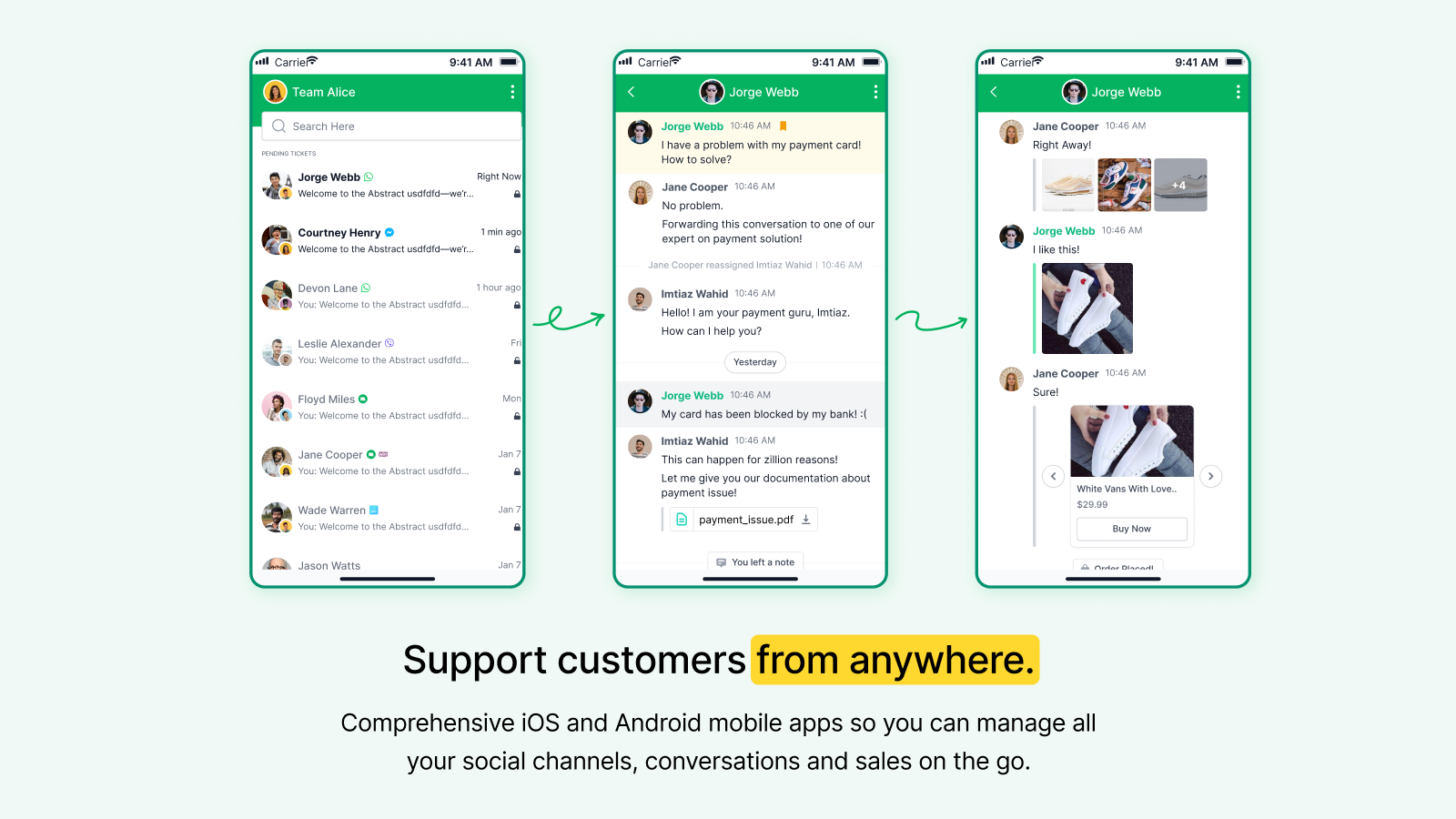 No more switching tabs to respond to WhatsApp, Live Chat, Facebook Messenger, Instagram, Line, Telegram, and Viber. Centralize all your customer interactions under one dashboard. Use our iOS or Android mobile app that allows support from anywhere.
