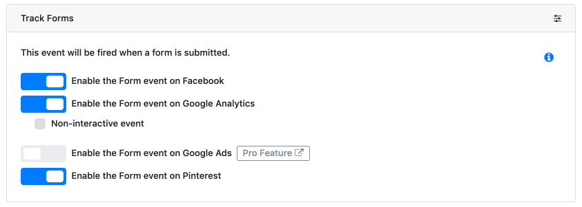 More triggers for your own events: Clicks on links and CSS Selectors, Number of Page Views, Mouse over CSS Selectors, Embedded video views, Email link click, Page scroll, Post type, and direct integrations with various Form plugins plus Elementor forms.
