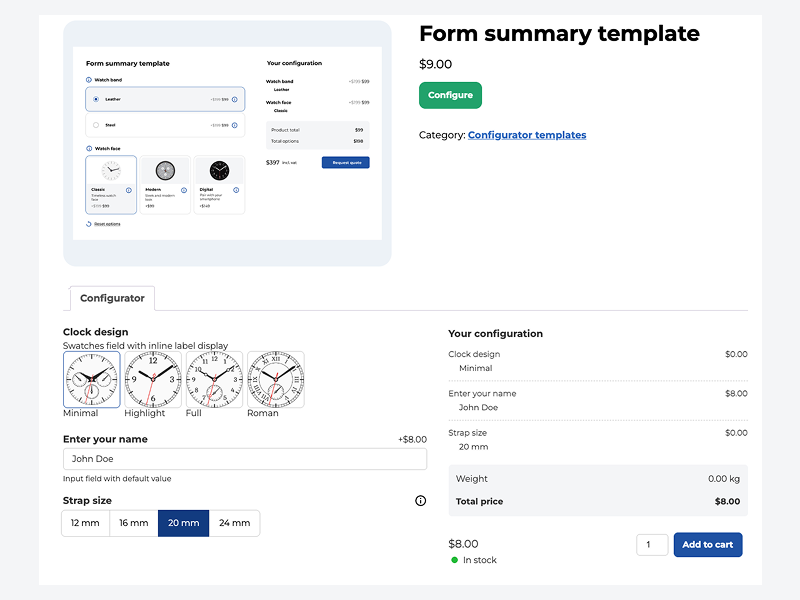 - Shortcode display: display configurator forms on any post or page using shortcode display