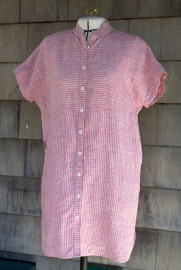 The dress view has a very loose fit, cut-on short sleeves with a turned back cuff, two-piece shirt collar, button down placket, and a shirt-tail hem. The pocket bags are loose and hang down below the hem at the side which makes for some interesting design opportunities like color blocking.