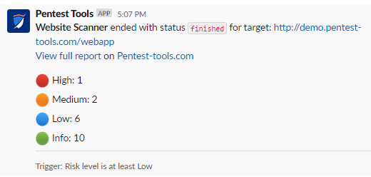 To configure a slack integration, go to your Pentest-Tools.com dashboard and find the integrations menu on the sidebar. Here you can configure integrations with 3rd-party apps which you can later use for notifications (Slack, Webhooks), or vulnerability management workflows (JIRA). More integrations will be added in the future.