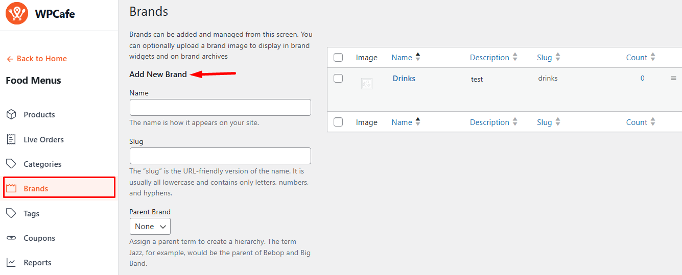 In WPCafe, you can assign brands to your food items. This helps customers easily search and filter products by brand, allowing them to quickly find their preferred items.