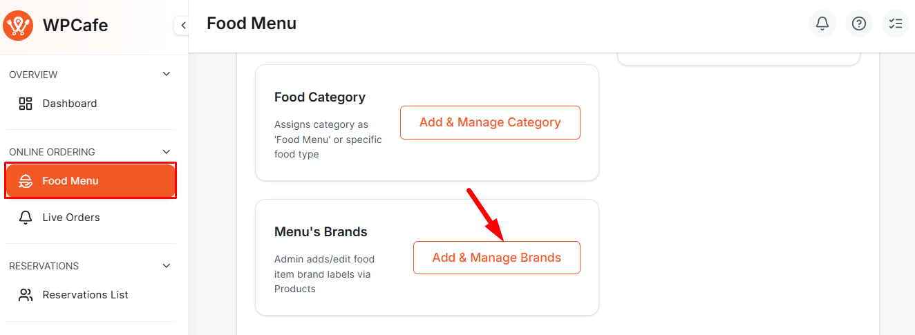 From here, you can add new brands or manage existing ones for your food menu.