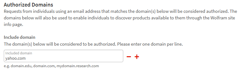 - In the “Include domain” field, enter your organization’s domain whose users shall be automatically authorized to use your site’s Wolfram products. Click + to add further domains.