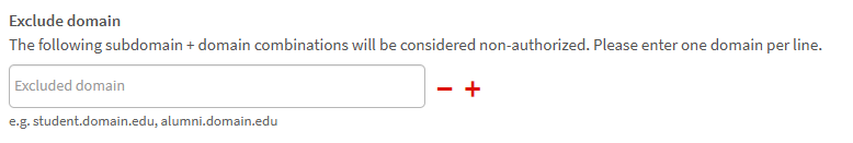 - In the “Exclude domain” field, add the individual subdomain whose users’ access shall be reviewed or denied. Click + to add further subdomains.