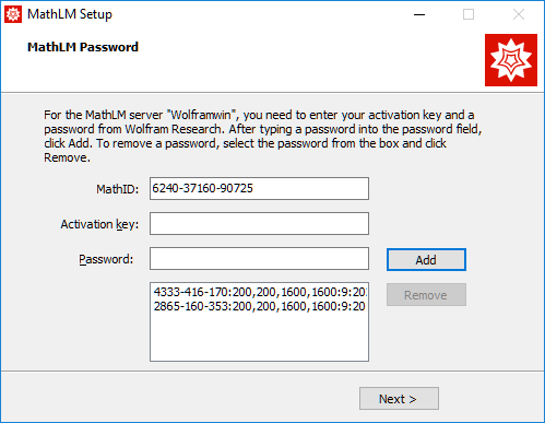 - Follow steps 6 and 7 from the MathLM installation instructions to enter the activation key and password for one of the two products.
