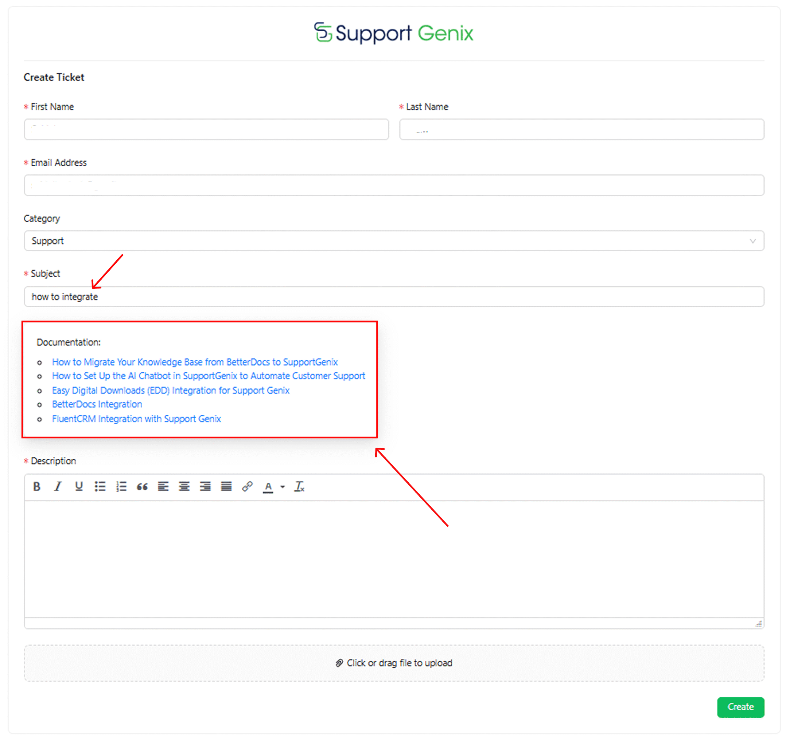 With this integration, Support Genix empowers users to access relevant documentation directly within the ticketing system. By suggesting related articles based on user input, this feature reduces ticket volume and enhances the efficiency of your support team.