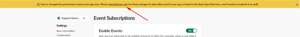After updating the appβs permission scopes, you will receive a notification to reinstall the app. Follow the prompt to complete the reinstallation.