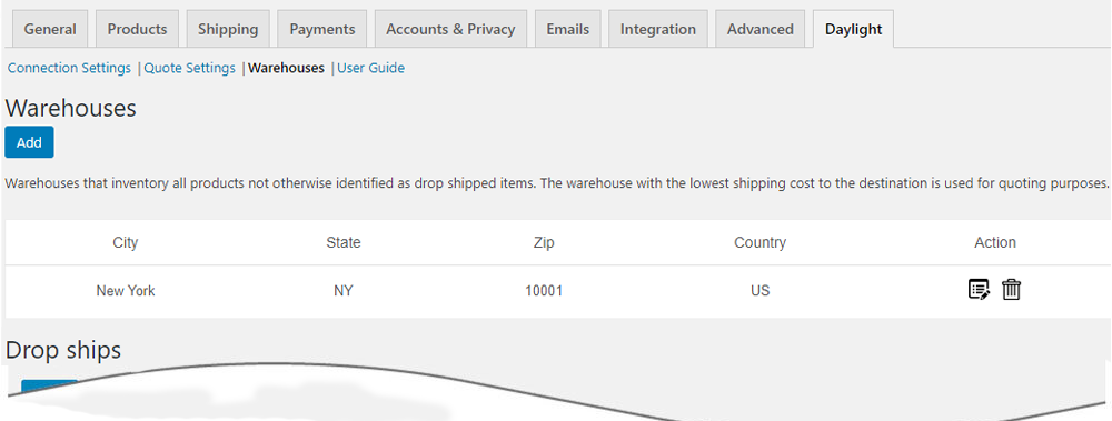 Go to WooCommerce => Settings => Daylight Freight. Use the Quote Settings link to enter the required information and choose