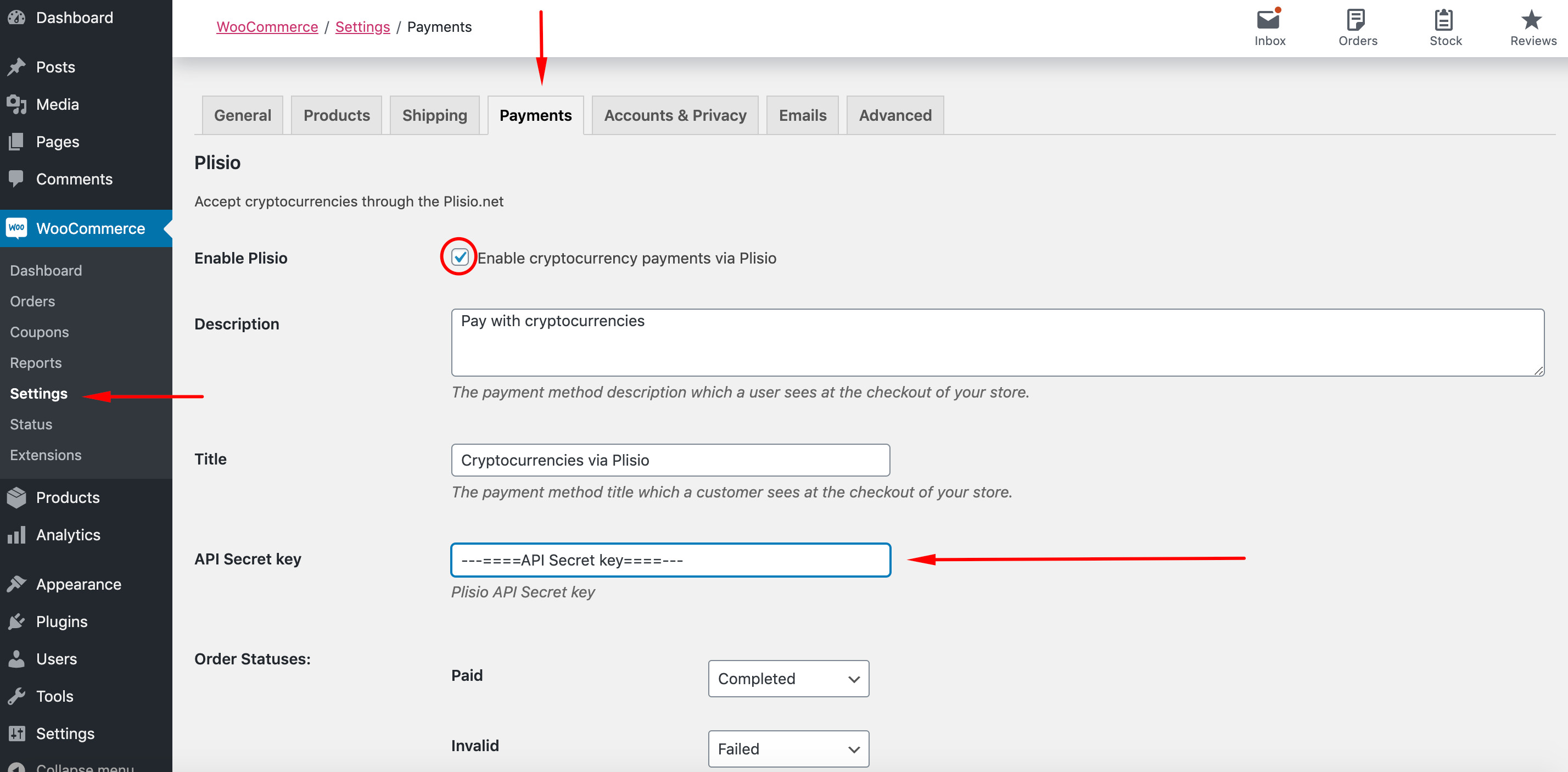 - Enter Secret Key data to WooCommerce-Plisio Plugin Settings: Admin » WooCommerce » Click on Checkout tab » Find ”Plisio” in Payment Gateways table » Click ”Settings”