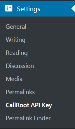 - After activation, you will be redirected to a Settings page within WordPress(you can also access this later under Settings menu in admin panel in wordpress), where you will be asked a CallRoot API Key. You will get this API key from the Integrations page on CallRoot.com.