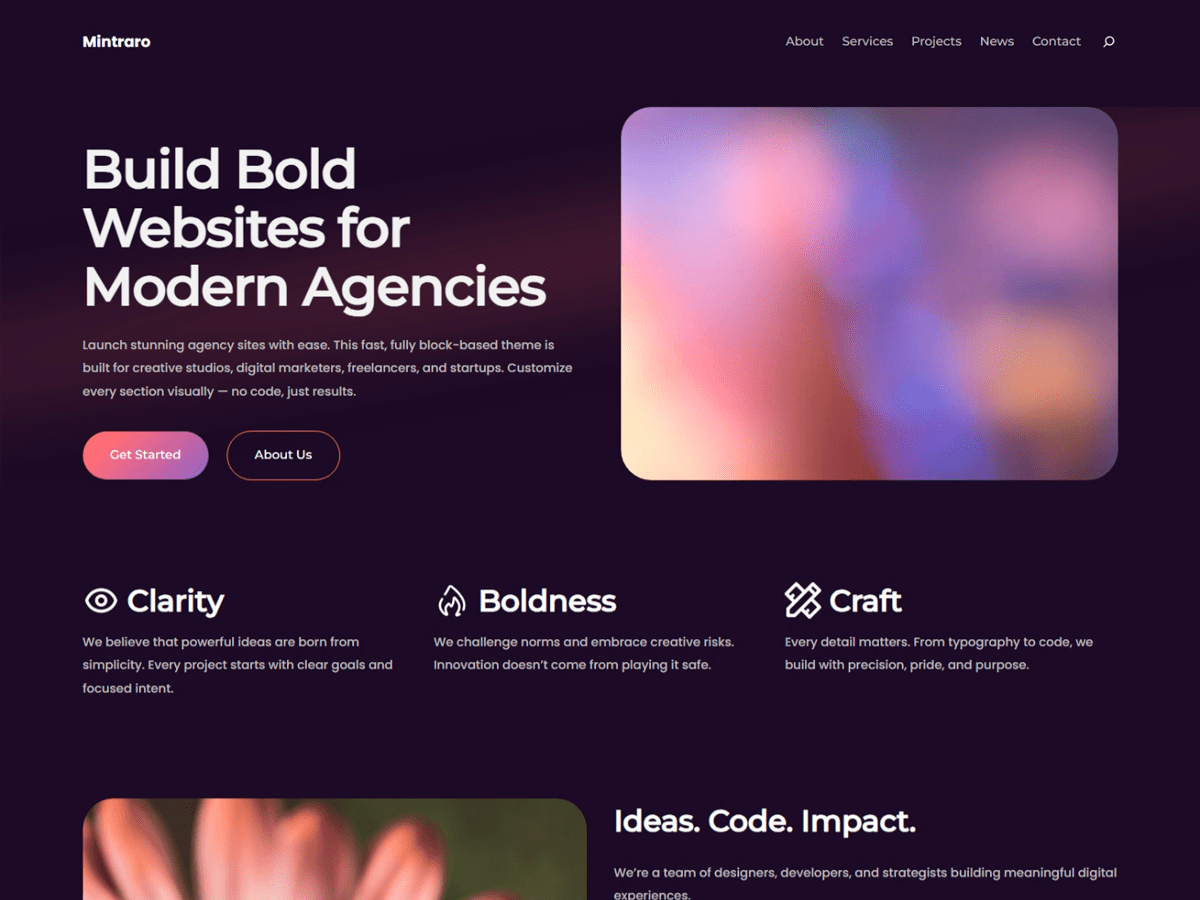 Mintraro is a dark WordPress Block Theme crafted for bold agencies, creative studios, and digital pioneers who demand elegance with edge. Featuring a fully immersive layout with smooth gradients, glowing highlights, and modern typographic rhythm, Mintraro brings sophistication to every scroll. Built for Full Site Editing, it includes responsive block patterns, customizable sections, and fluid layouts that adapt beautifully across devices. Whether you’re launching a portfolio, agency site, or digital product, Mintraro gives you the freedom to build stunning web experiences with clarity, impact, and style. Demo: https://effethemes.com/themes/mintraro-wordpress-theme