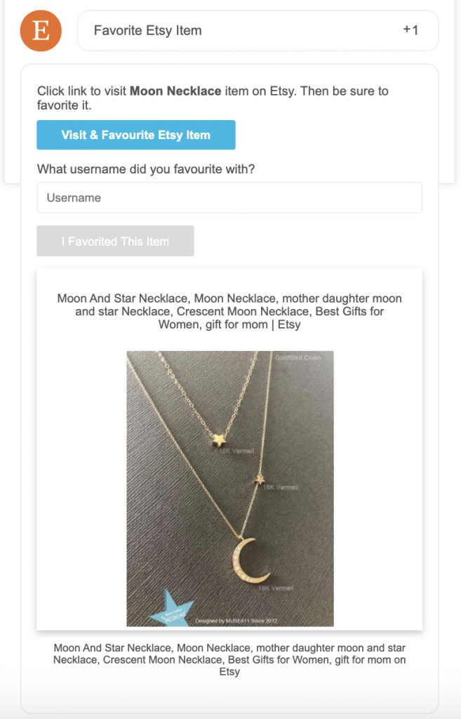 The user will be asked to visit the Etsy shop and select a favorite shop. They will receive credit for this entry after verifying the username they used.