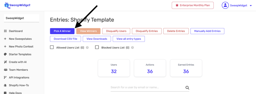 On the Entries page, click the Pick A Winner button (blue).