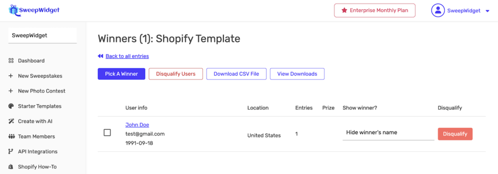 | User info | Winner’s name, email address, and entry date |
