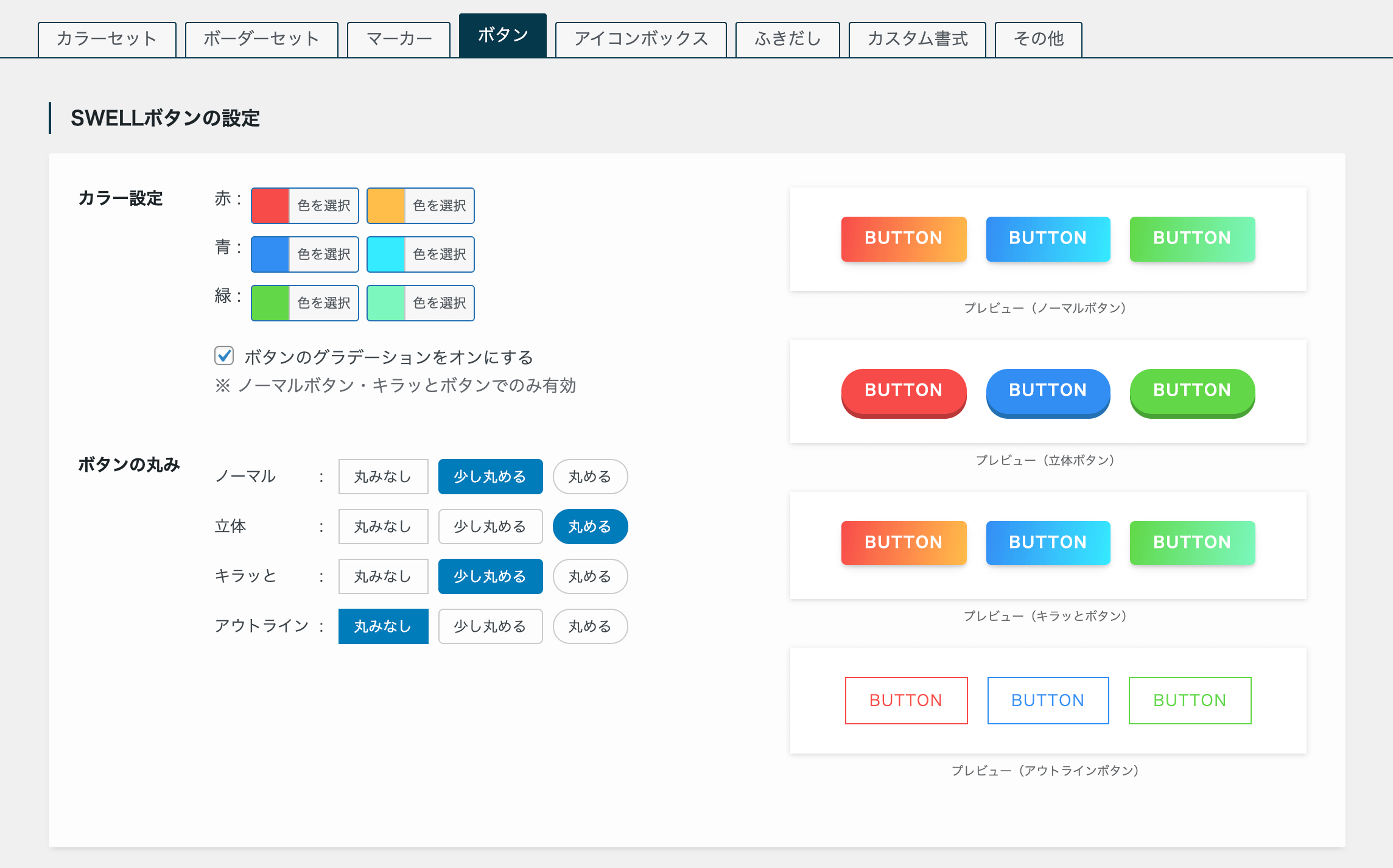 SWELLボタンのデザインは、「色」と「丸み」をそれぞれ設定できます。