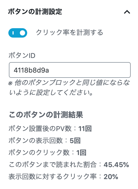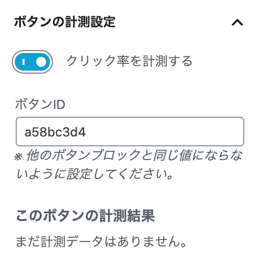 この「クリック率を計測する」をオンにすると、次のように、ボタンIDの設定項目と計測データの確認エリアが展開されます。