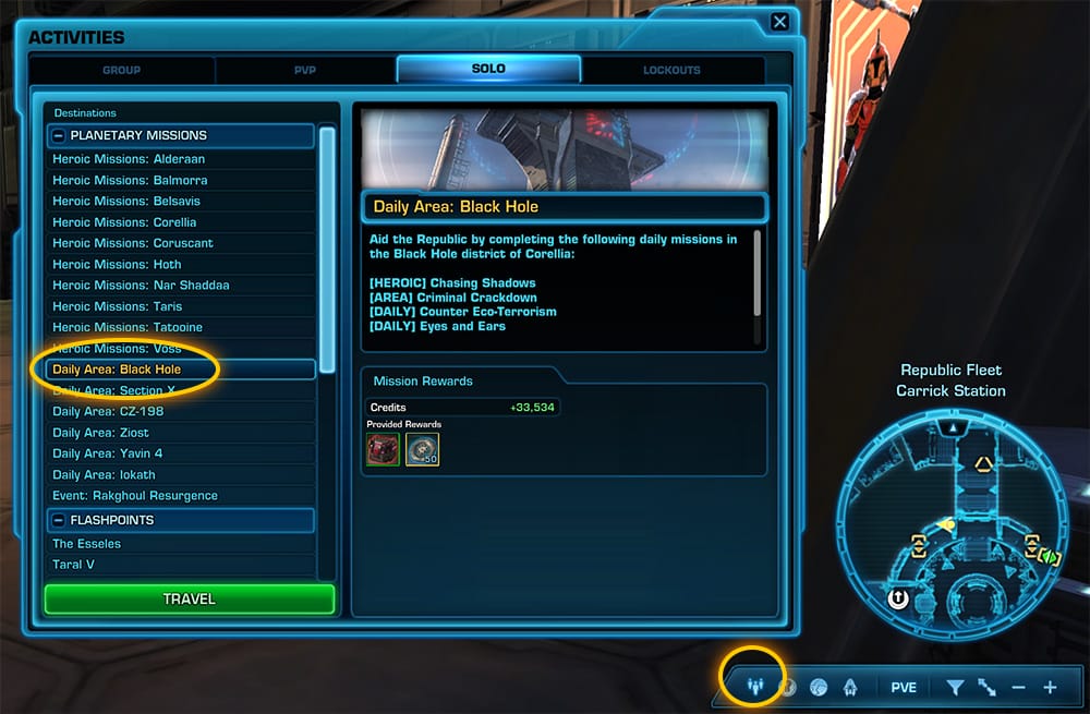 The fastest way to get to the Black Hole dailies if you plan to repeat them is by using the Activity Finder. You can use this any time you want to repeat the quests, as it will teleport you directly in front of the daily/weekly quest terminals. You can do this by clicking the icon of “three little people” near your minimap, choosing the Solo tab at the top, selecting Daily Area: Black Hole, then clicking the green travel button. This also automatically gives you the weekly quest.