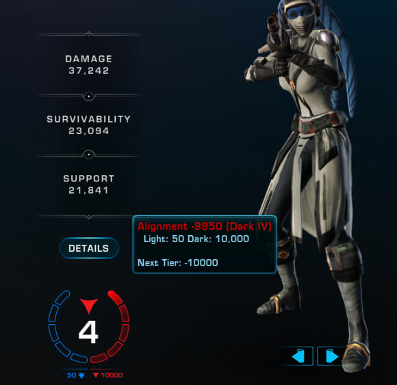 This panel is also where you can see your current alignment, and how many dark side points you have, by rolling over the alignment bar.
