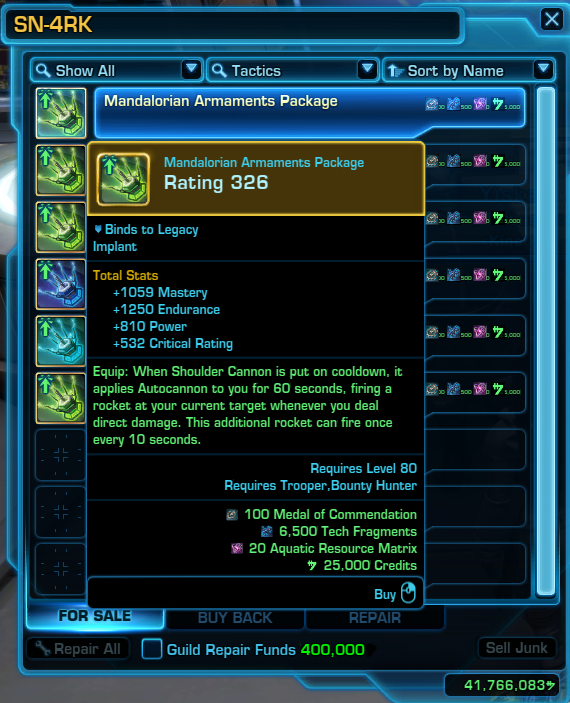 In previous expansions, you would collect a Set Bonus, a special type of gear that was specific to your Combat Style, and that bonus was attached to your armor pieces and you had to collect six different pieces to get a full Set Bonus, which would change and improve the way your abilities worked. In the 7.0 Legacy of the Sith expansion at level 80, Set Bonuses are being retired, and your new equivalent of a Set Bonus is called a Legendary Implant.