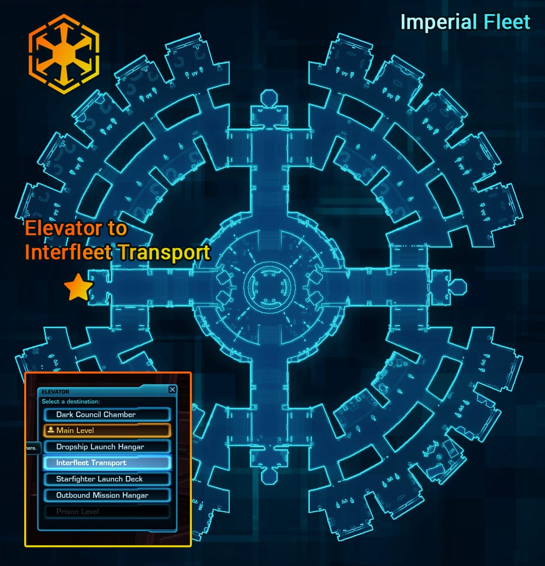 .. take the Taxi to the Ziost Shadow. To get there, use the Elevator on the west side of the Imperial Fleet to the Interfleet Transport level.