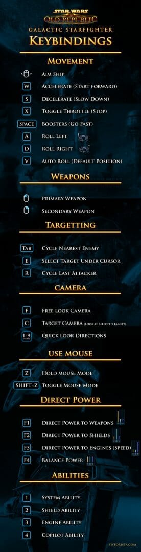 Galactic Starfighter is the intense free flight dogfighting ship combat mode available in Star Wars: The Old Republic. Galactic Starfighter is available to all players for free starting at level one, and is not restricted to high level characters or to subscribed players. It has a steep learning curve, but is a lot of fun once you start understanding how it works.
