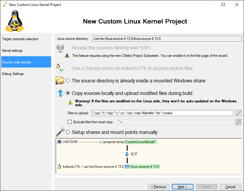 - Once the kernel source package is setup, the wizard will ask you for a directory on the Windows machine where the sources will be copied. Note that Linux Kernel source is huge so ensure you have enough free space on your disk: