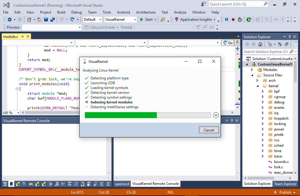 - Now we will test the debugging. Reboot your Linux machine so that the new kernel is loaded. Then press F5 to start debugging. If you are debugging this kernel for the first time VisualKernel will take some time to index the in-tree kernel modules: