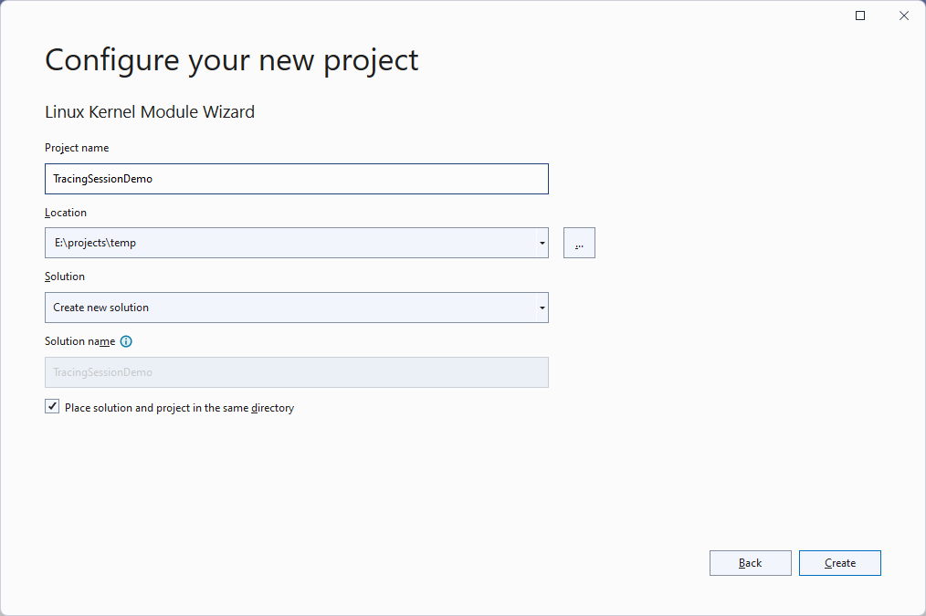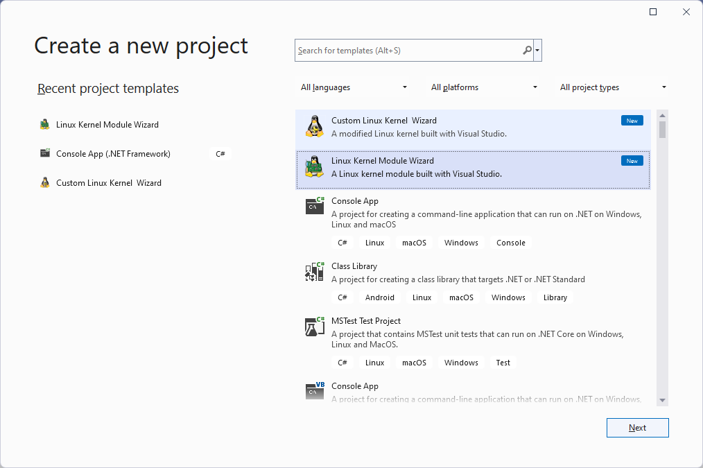 - Start Visual Studio and open the VisualKernel Linux Kernel Module wizard: