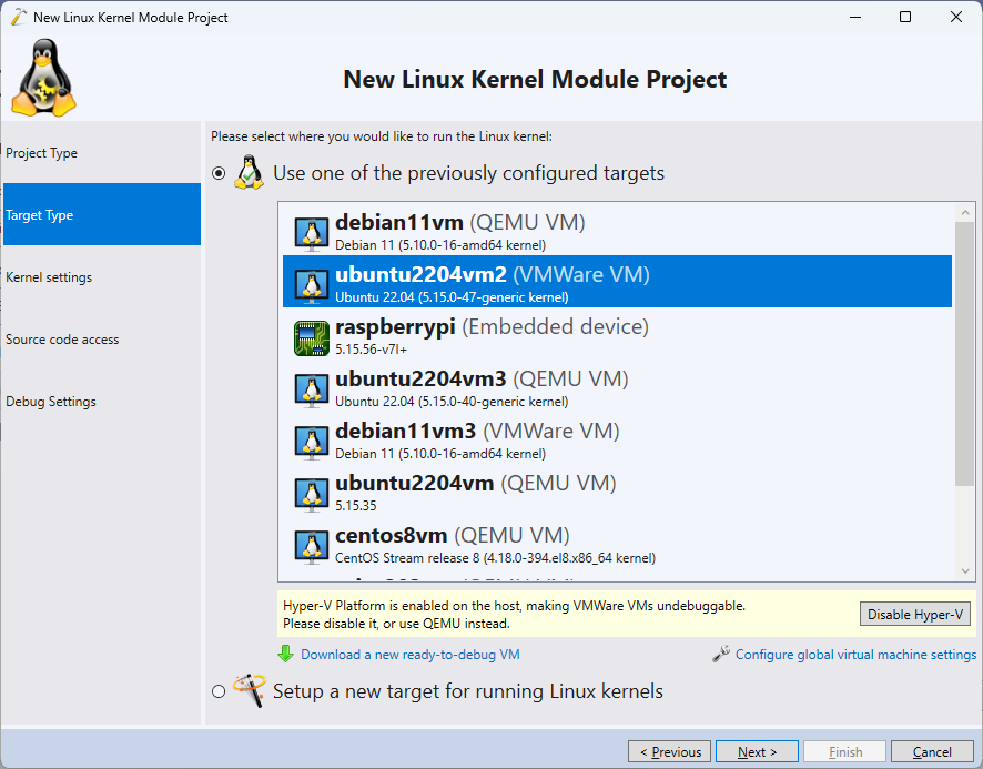 - Select the target where you would like to run the module. In this tutorial we will use a VMWare virtual machine that is itself running under Hyper-V, making it not debuggable using the regular means: