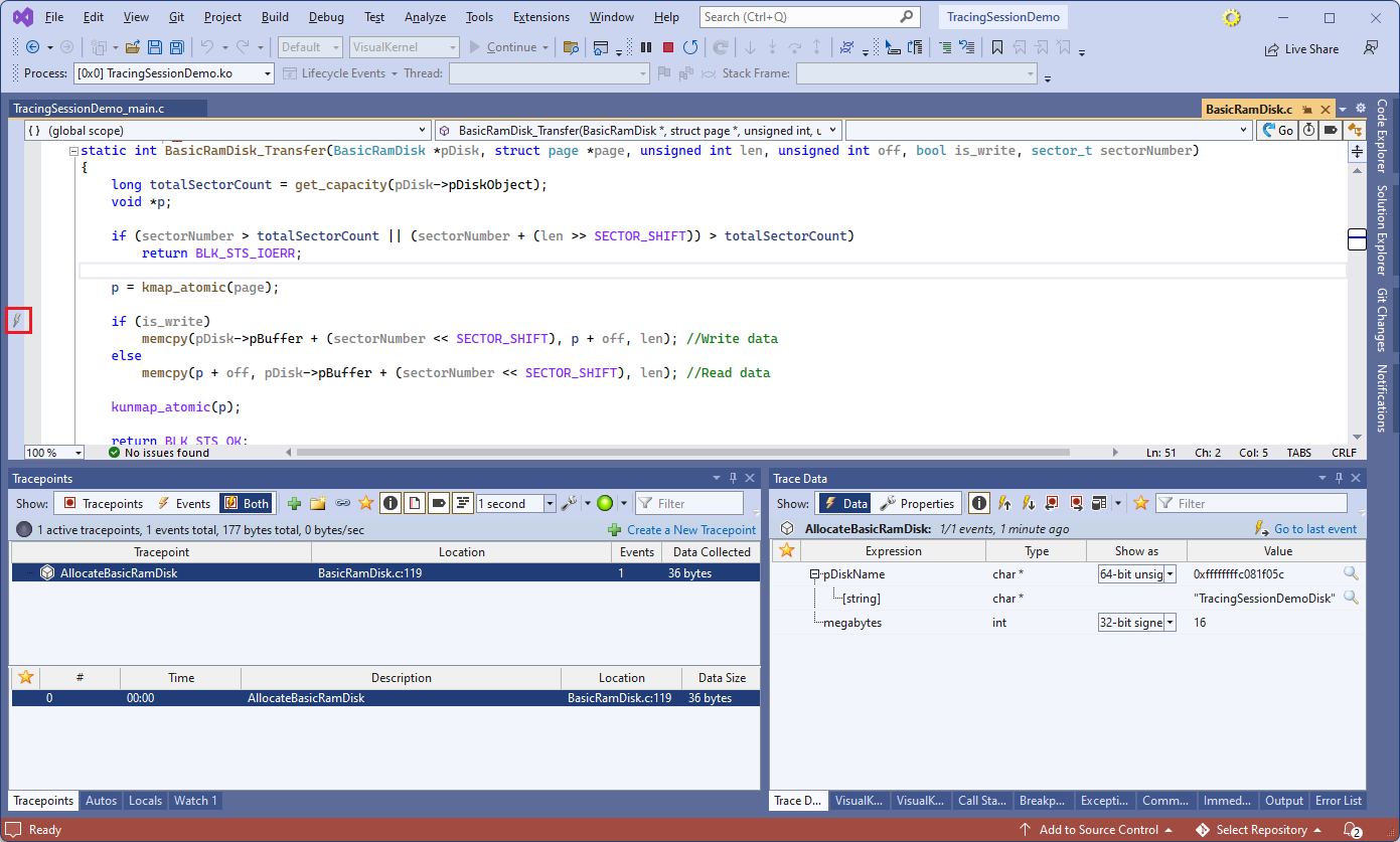 - Press “Finish” to create the project, then build the entire solution. Once it is built, press F5 to start a tracing session. When it launches, click on the tracepoint icon near the AllocateBasicRamDisk() function: